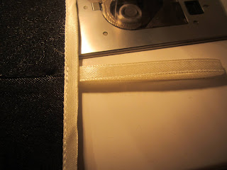 Далее я окантовываю нижний срез обтачки косой бейкой. Раскладываю срез косой бейки, прикладываю его в нижнему срезу обтачки лицевыми сторонами внутрь и строчу прям по сгибу косой бейки.